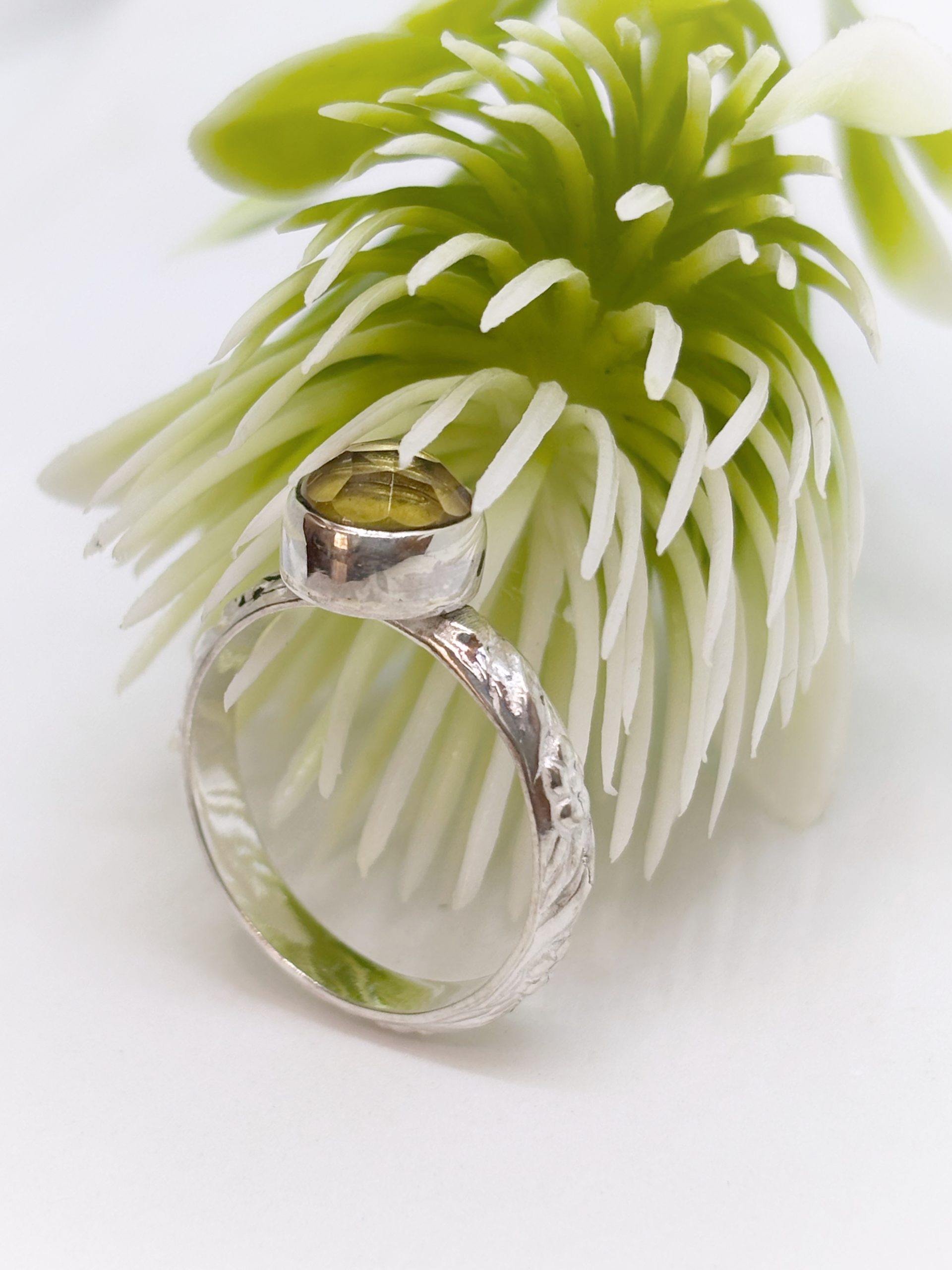 El Anillo Amanecer Dorado es una joya delicada y llena de energía, diseñada en plata 950 con un estilo artesanal único. Su banda delgada y finamente grabada resalta la belleza de su piedra central: un radiante citrino natural, cuyo cálido tono dorado simboliza la luz, la vitalidad y la prosperidad.