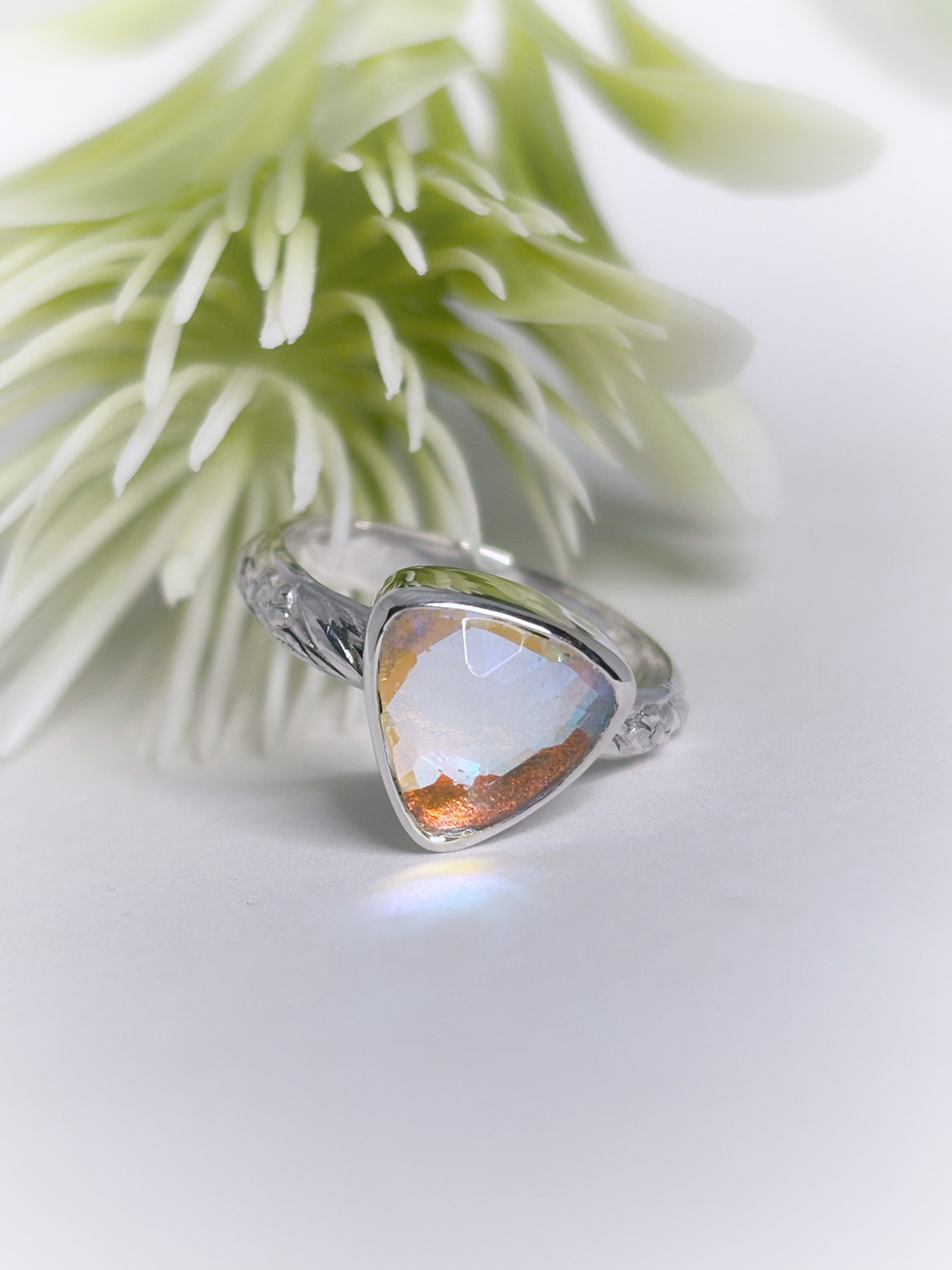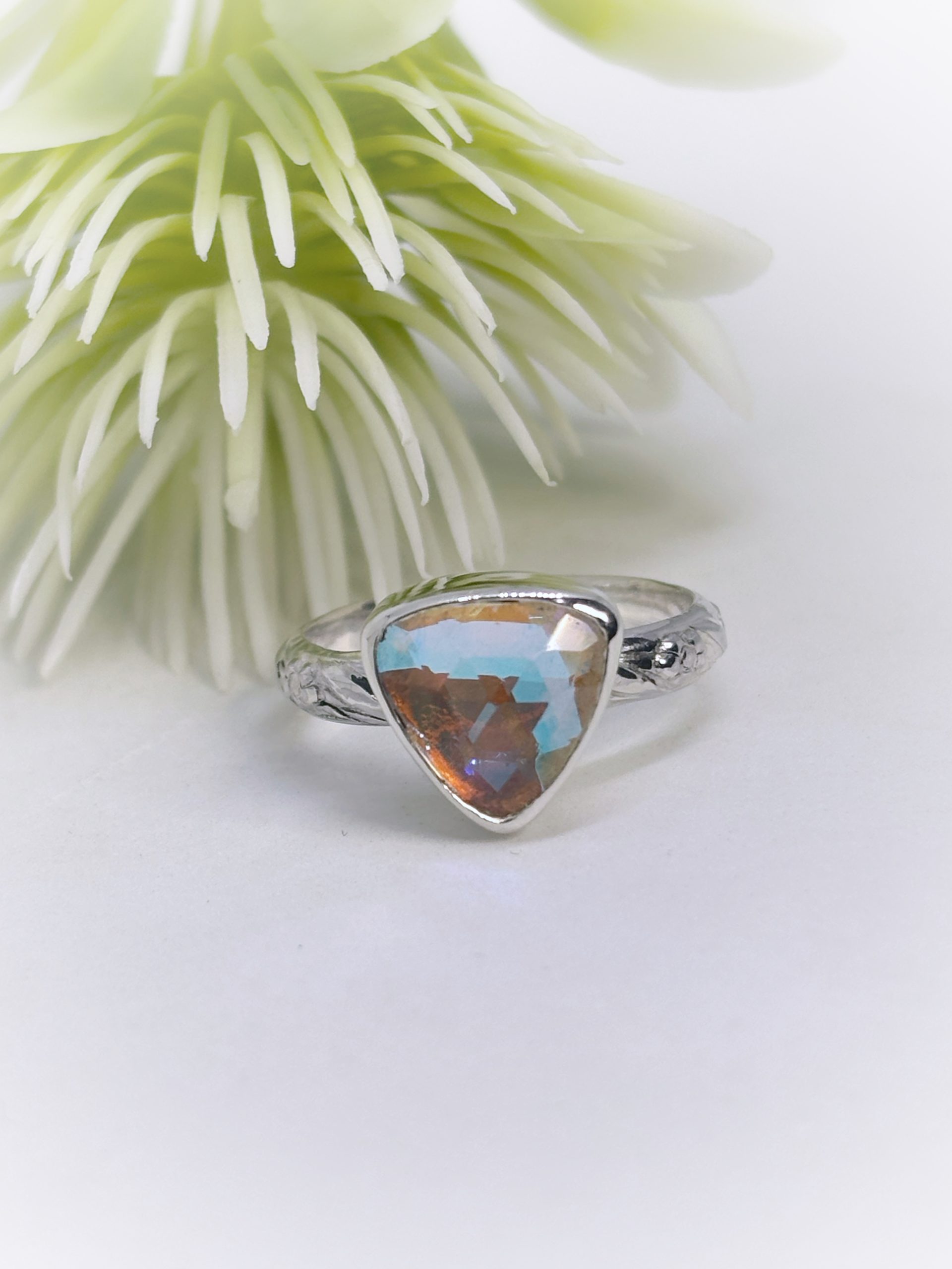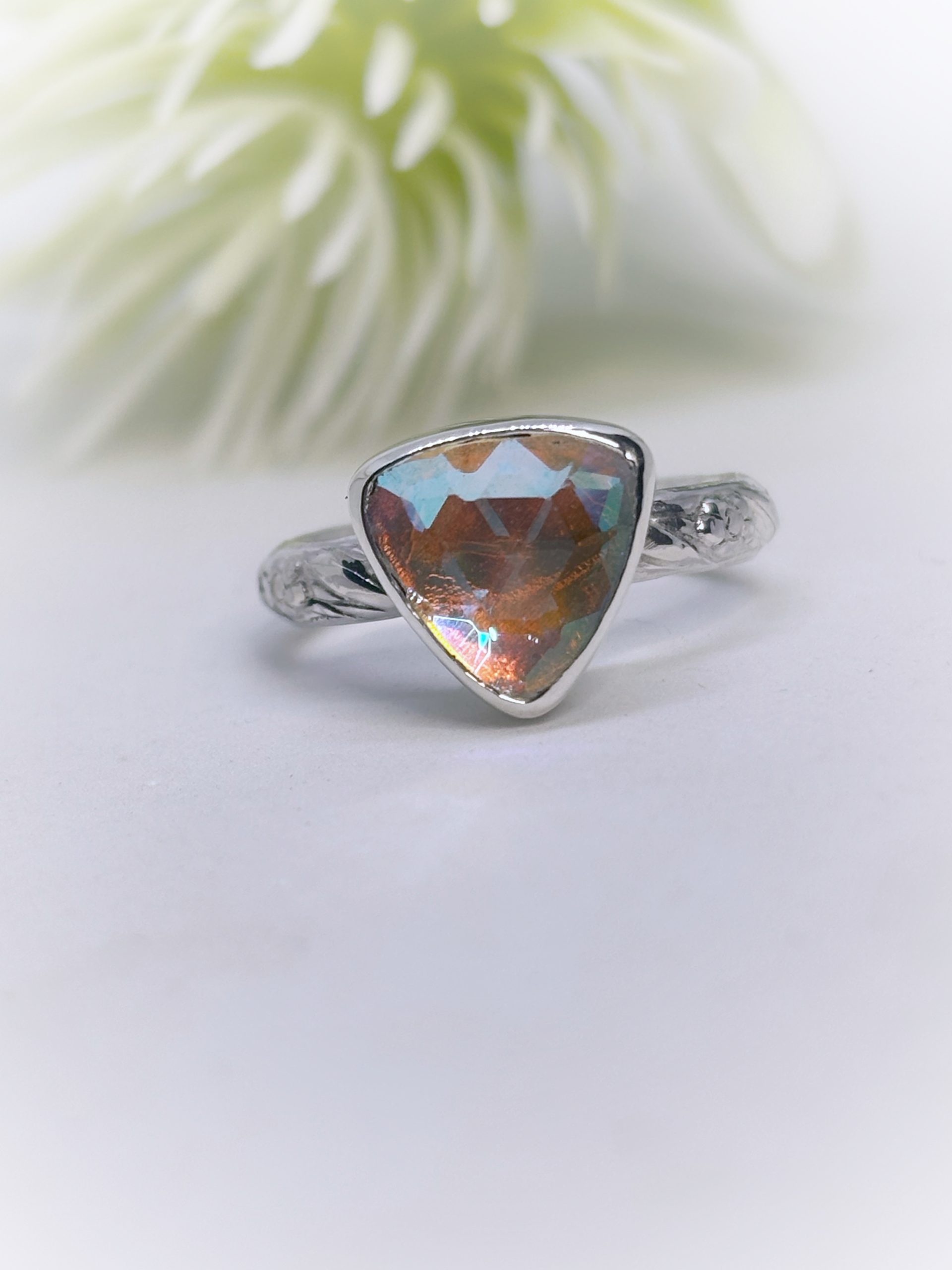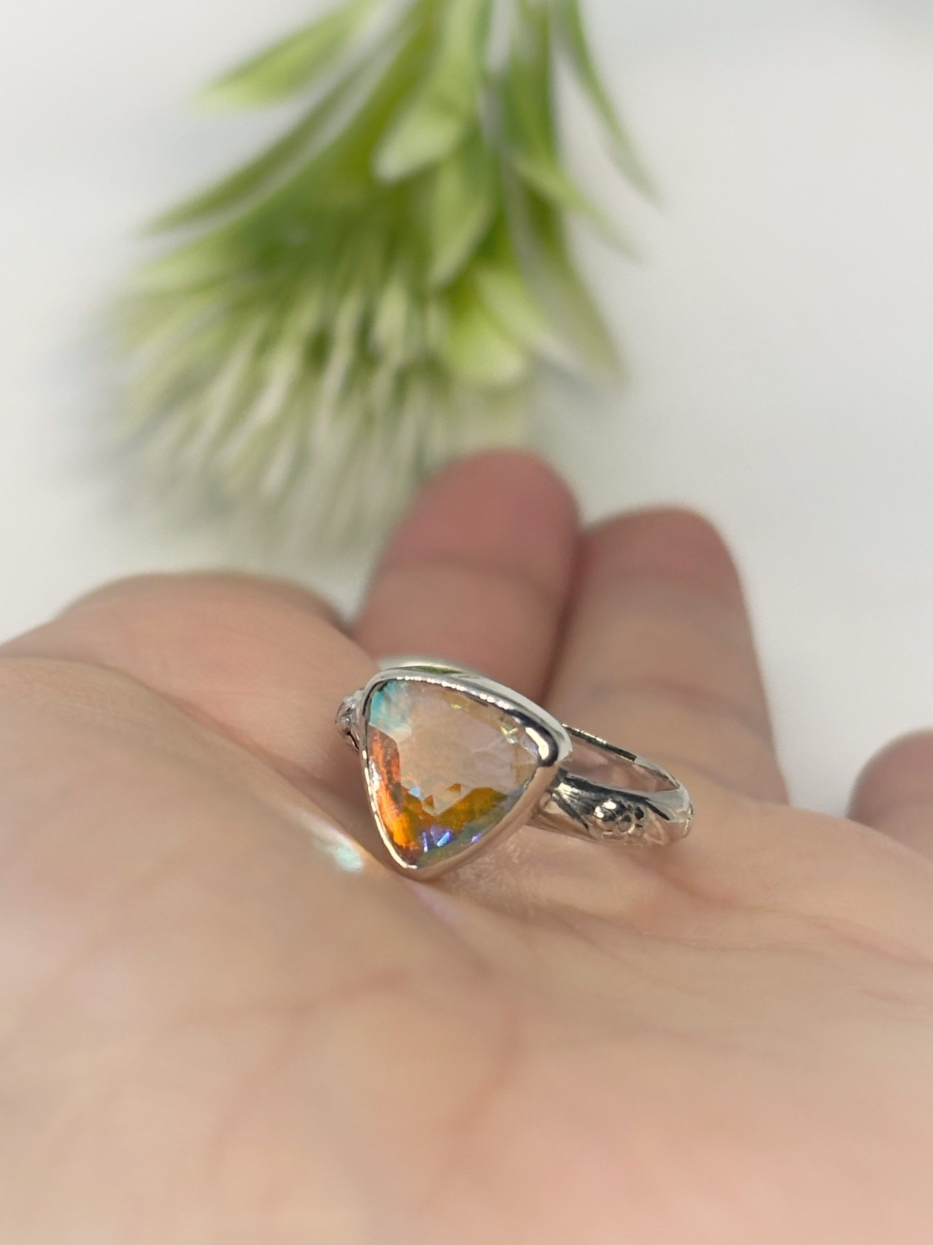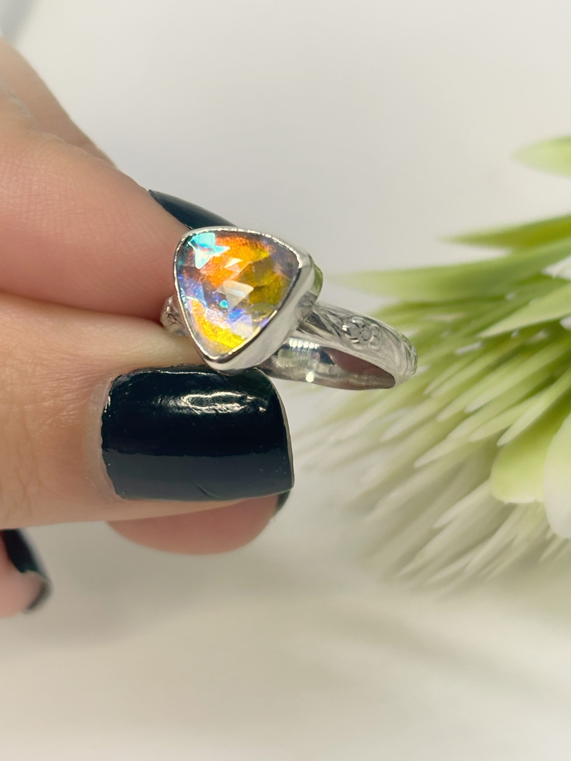 Anillo plata 950 y piedra hecha en laboratorio, opalo Boreal, asemeja las auroras boreales.