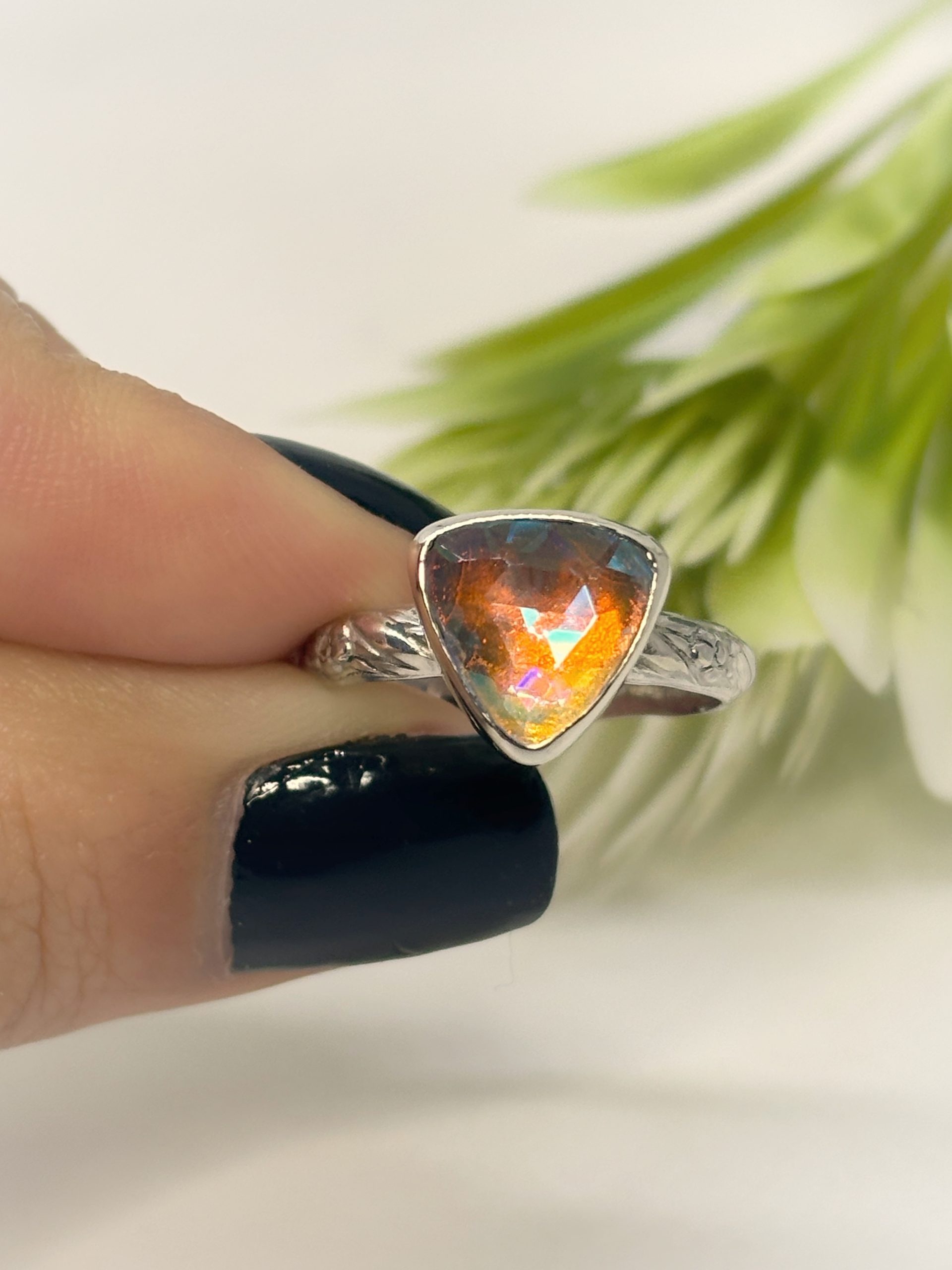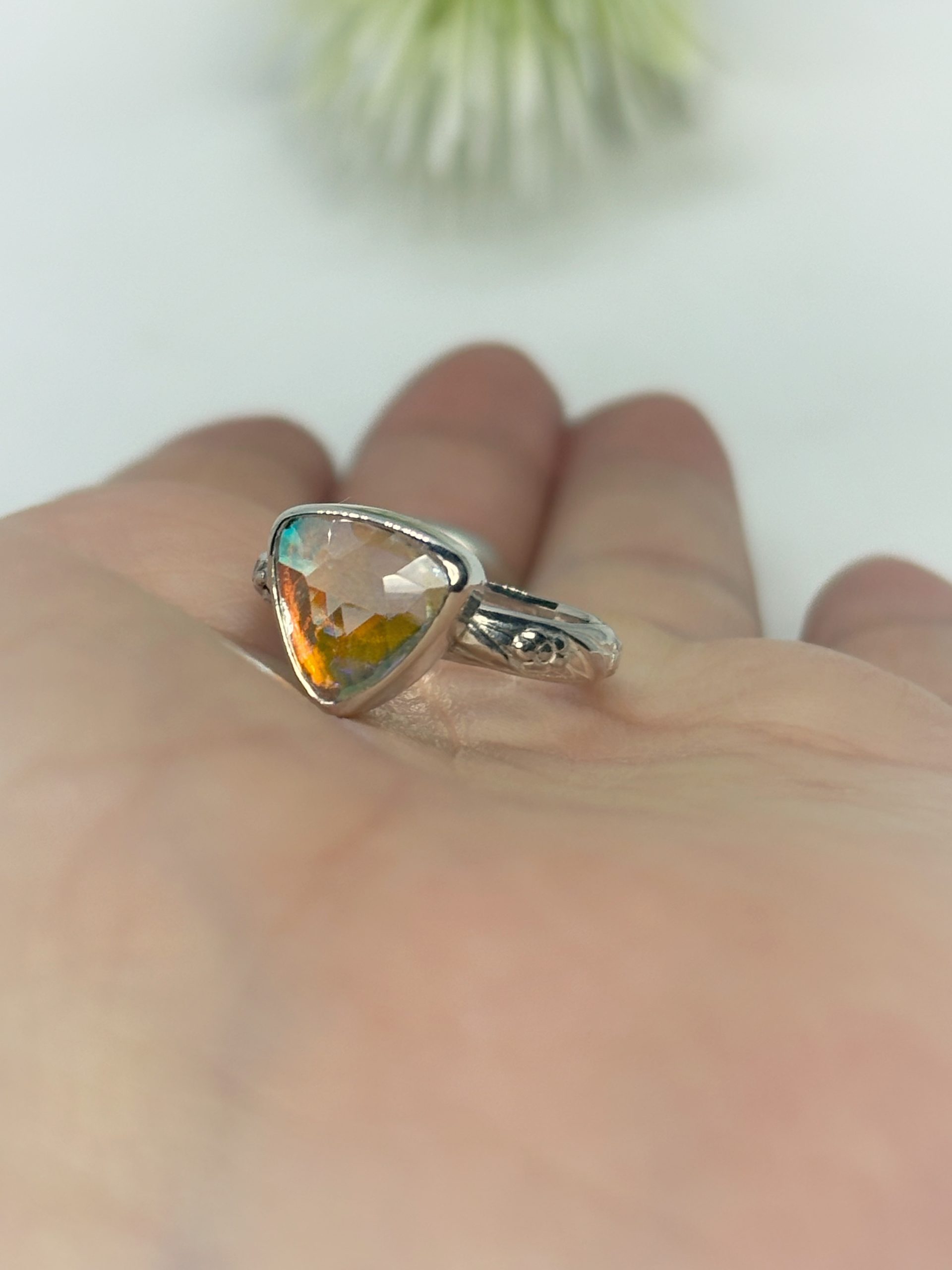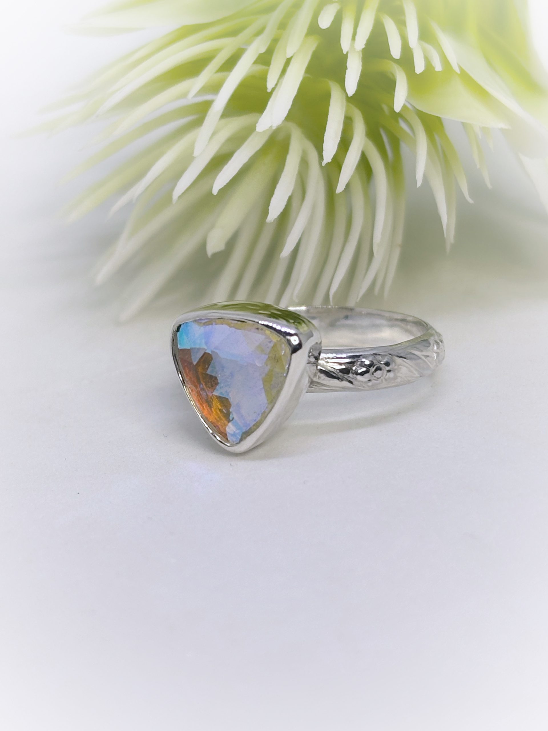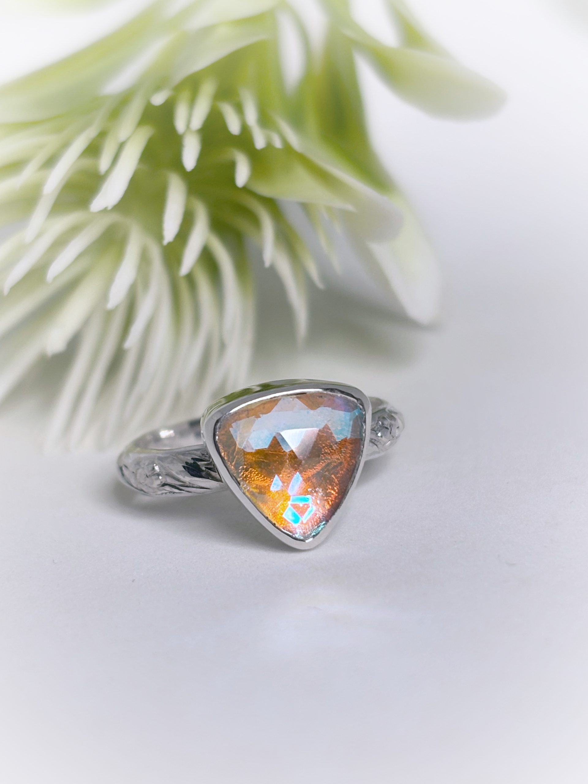 Anillo plata 950 y piedra hecha en laboratorio, opalo Boreal, asemeja las auroras boreales.