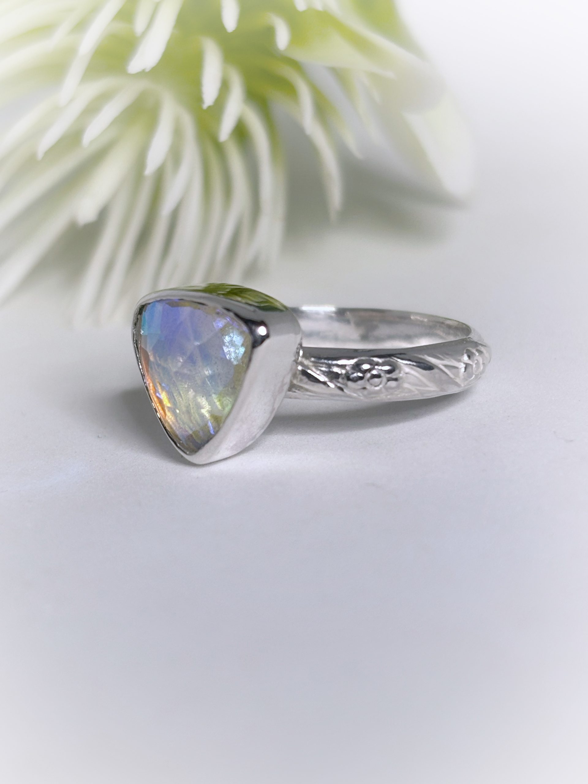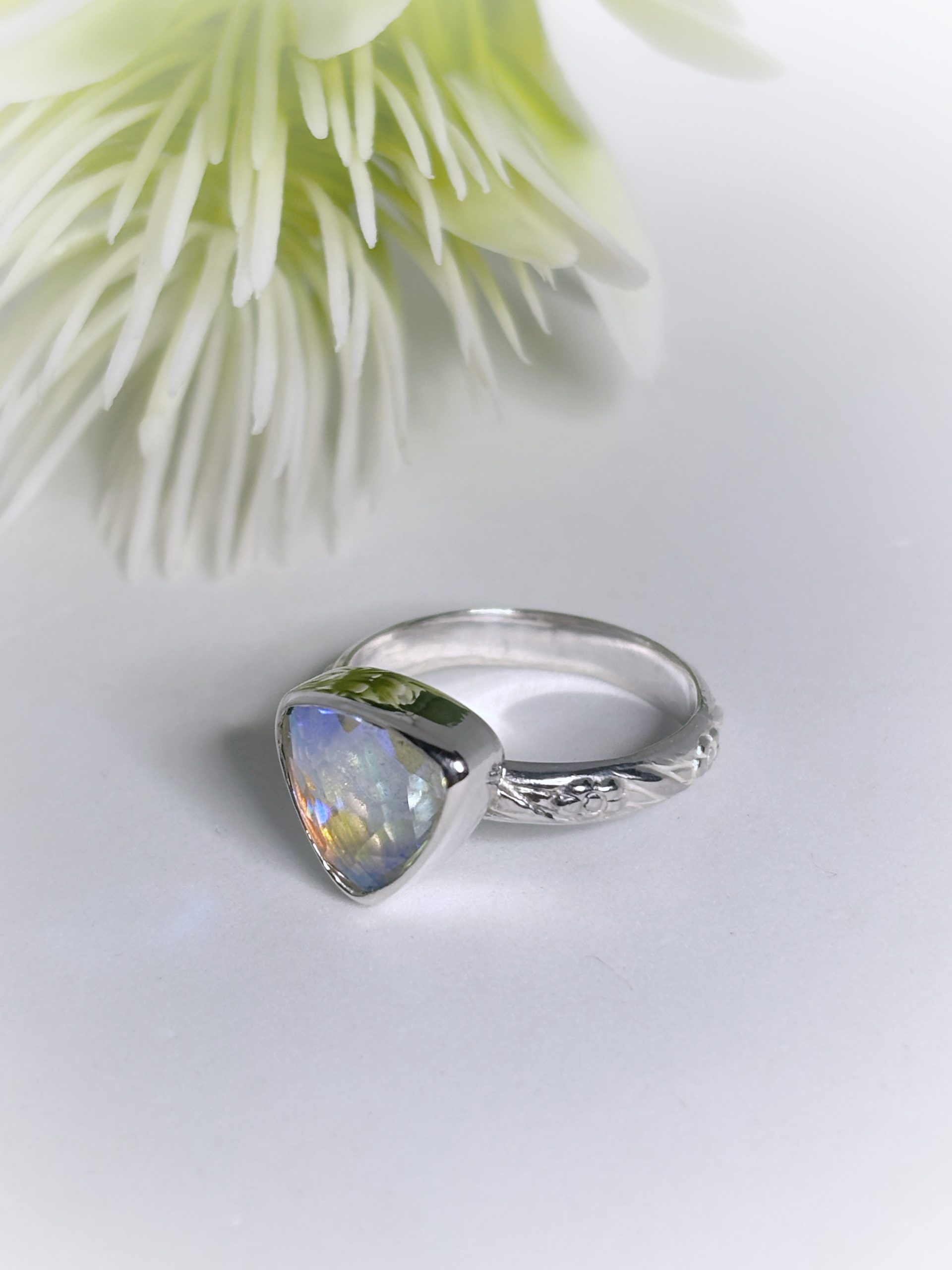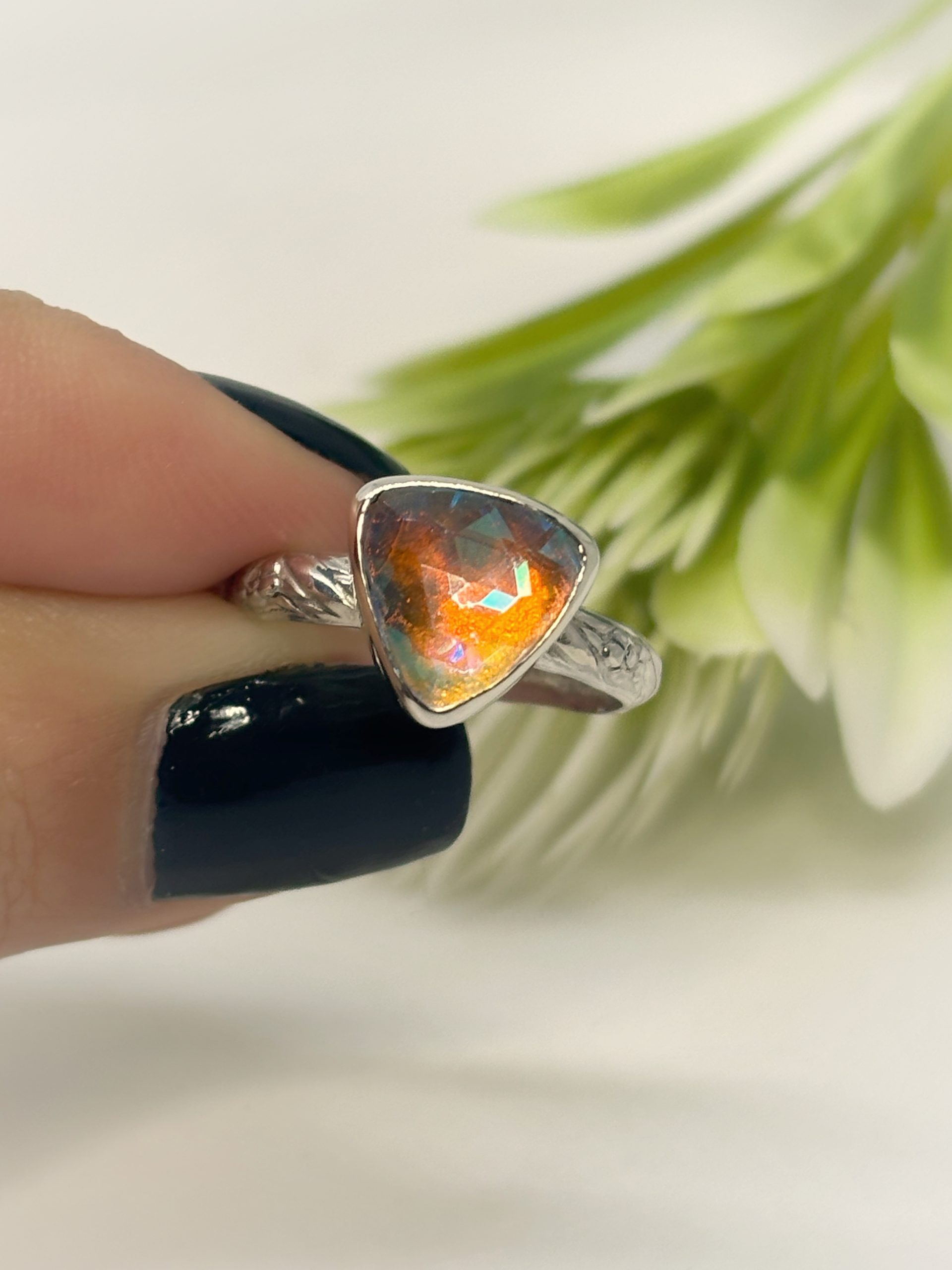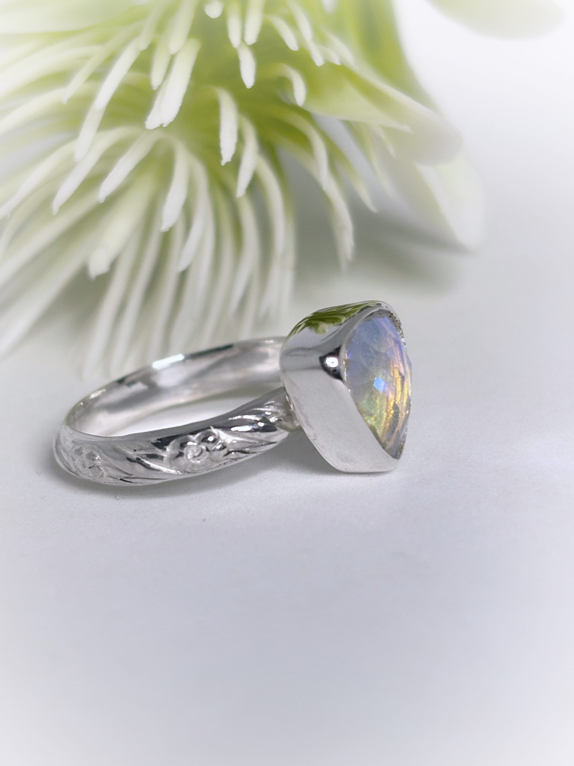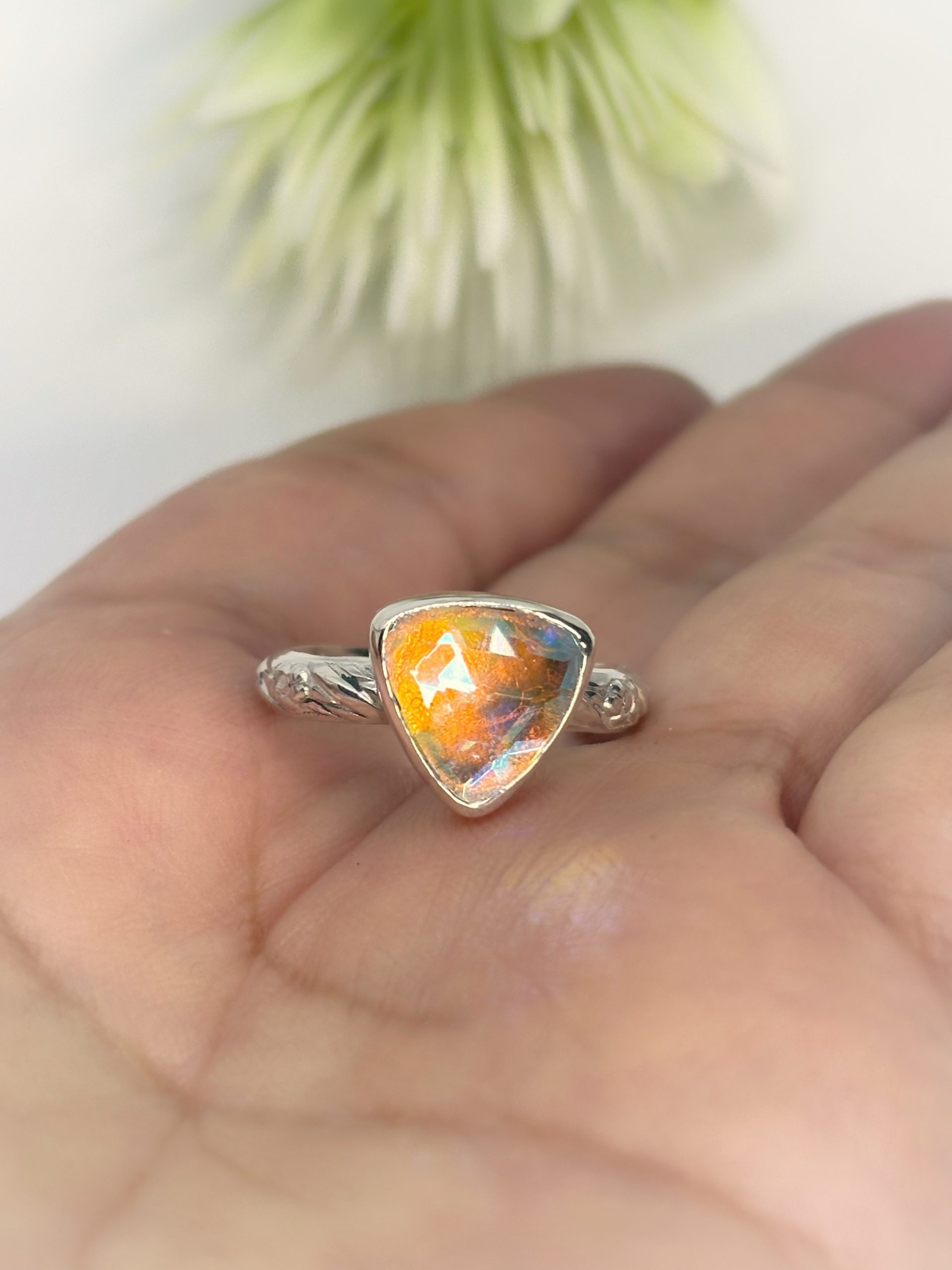 Anillo plata 950 y piedra hecha en laboratorio, opalo Boreal, asemeja las auroras boreales.
