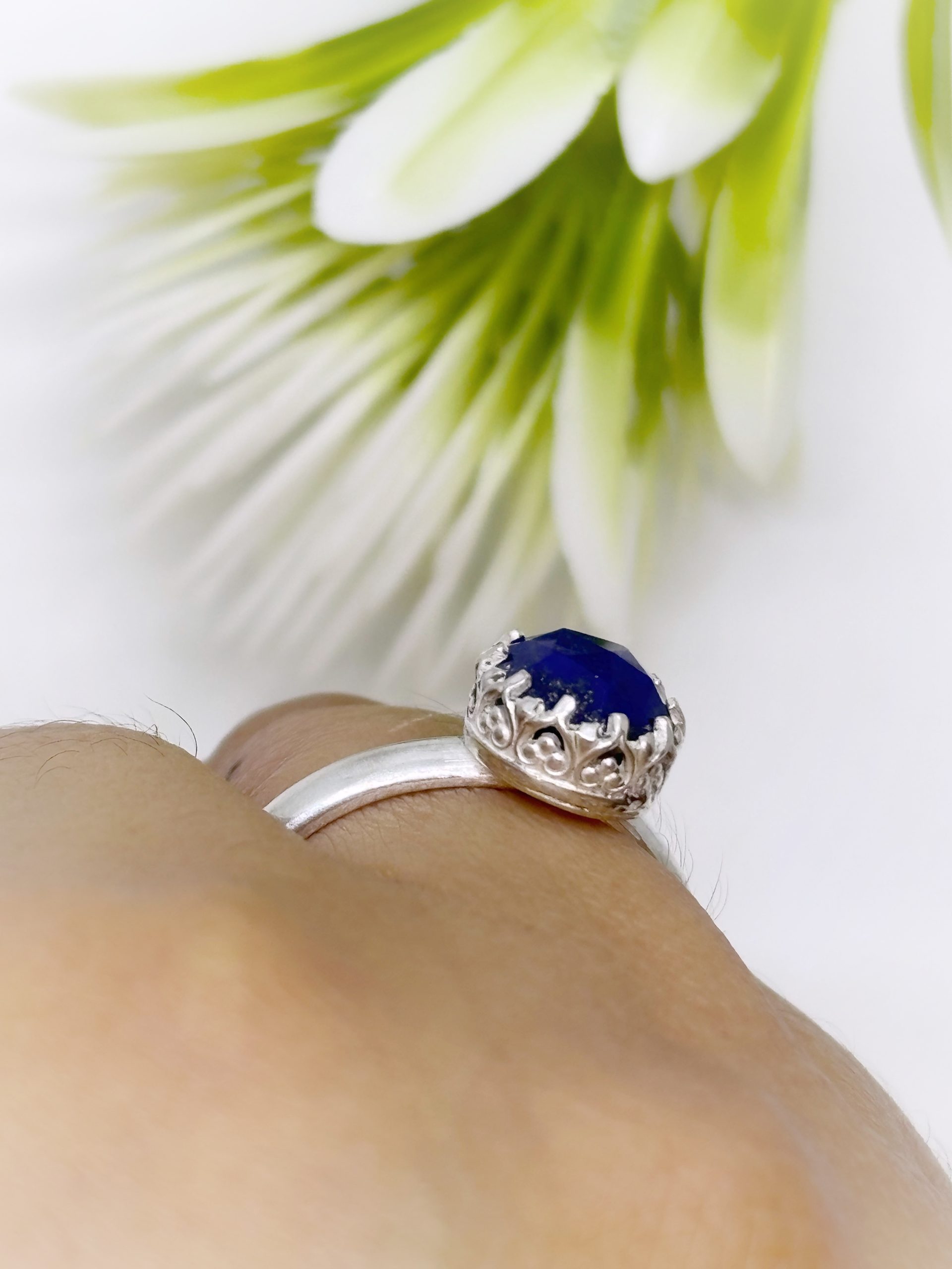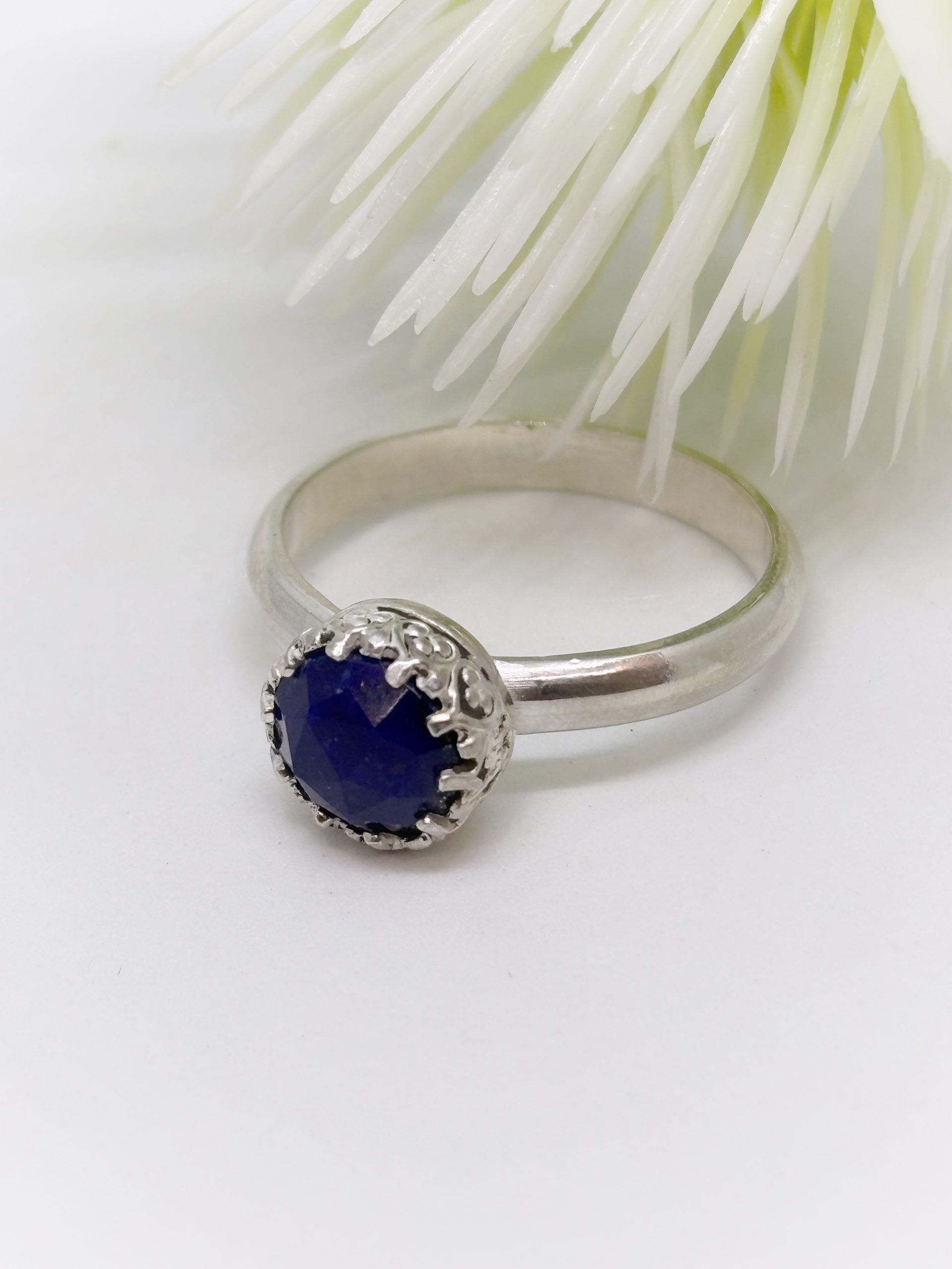 Anillo de plata 950, con un bisel de corona, y un lapislazuli corte rosa, que le da un toque refinado a esta joya.