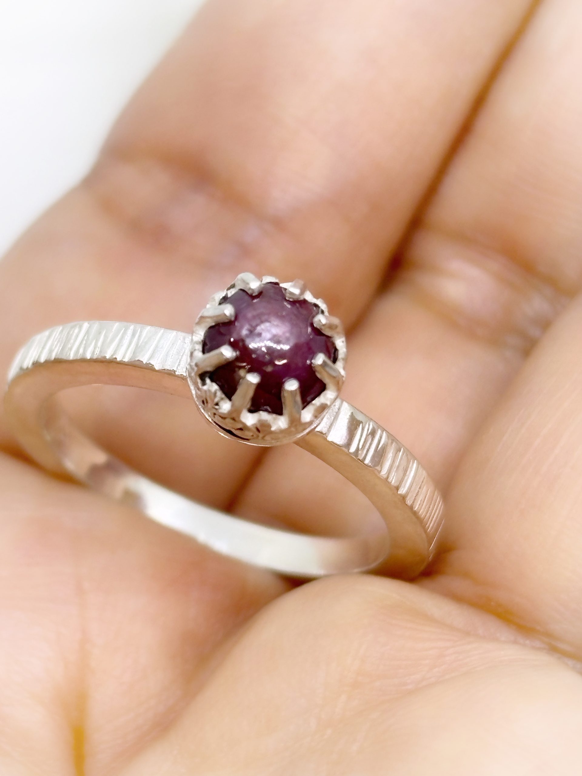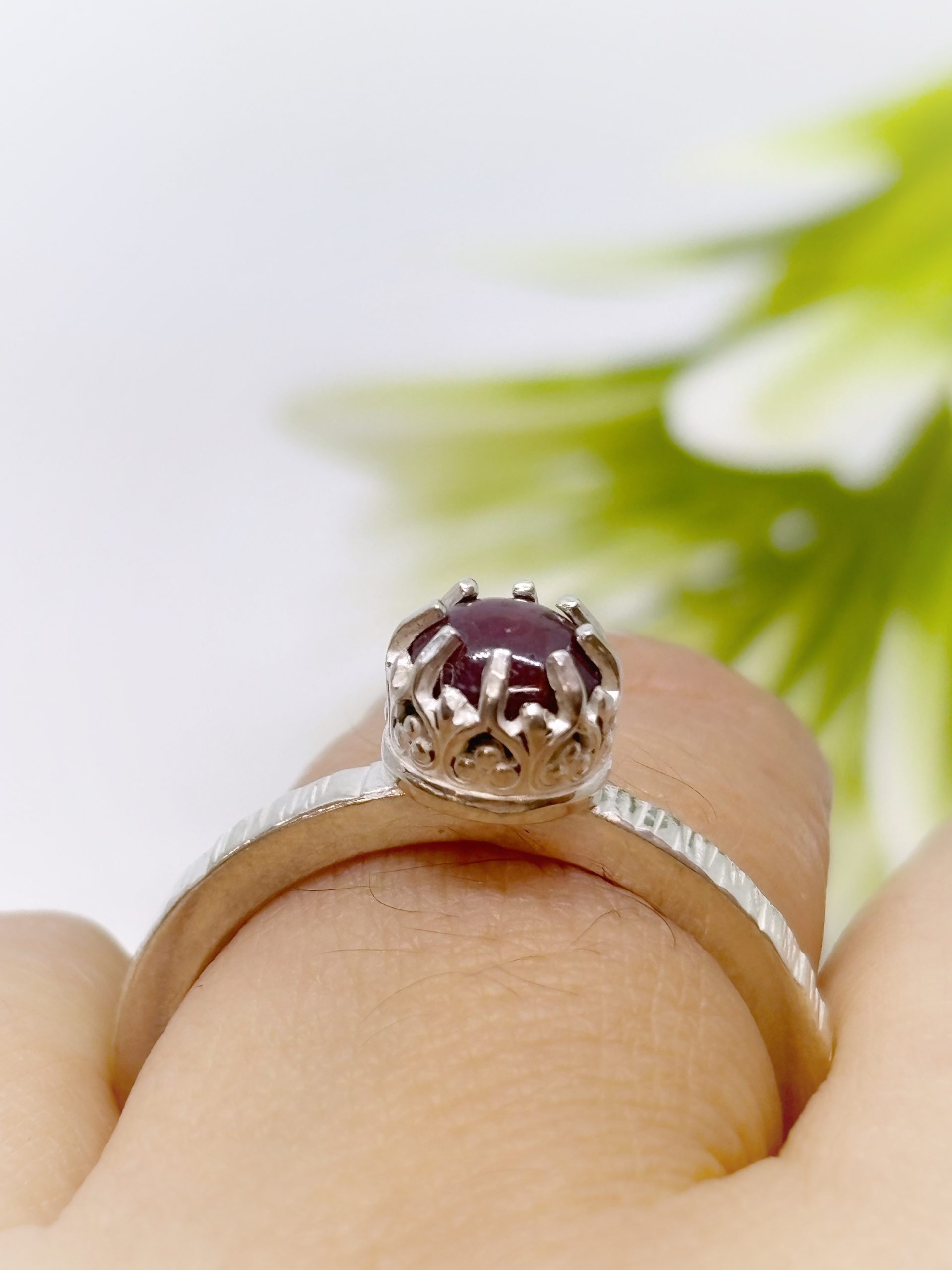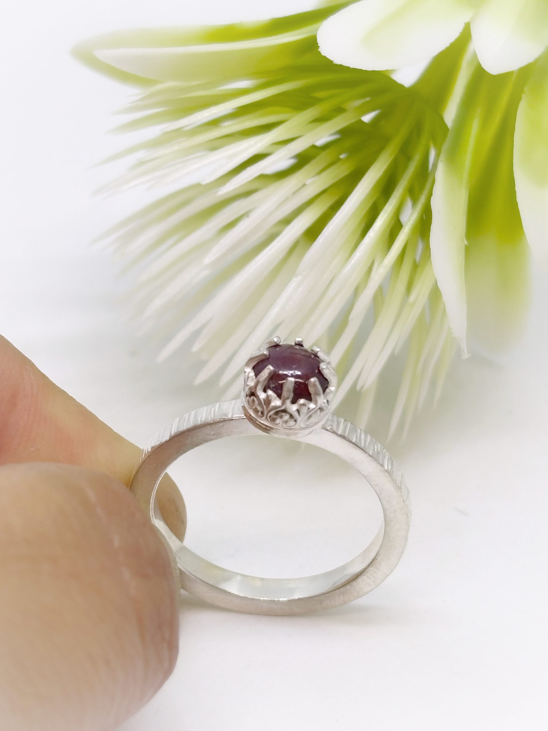 Anillo plata 950, texturado y con engaste corona, con un hermoso rubi star, se ve y luce delicado, perfecto para cualquier outfit.