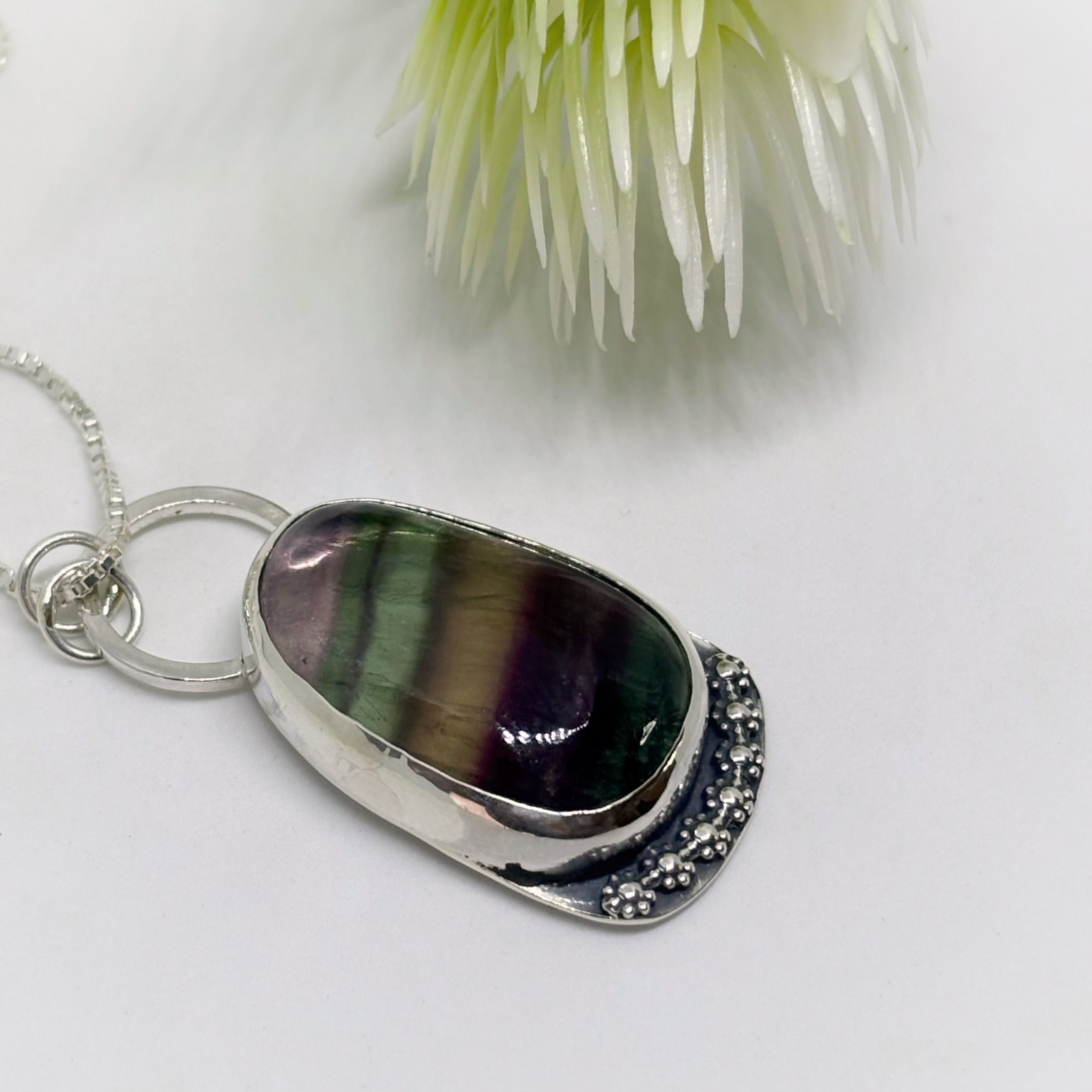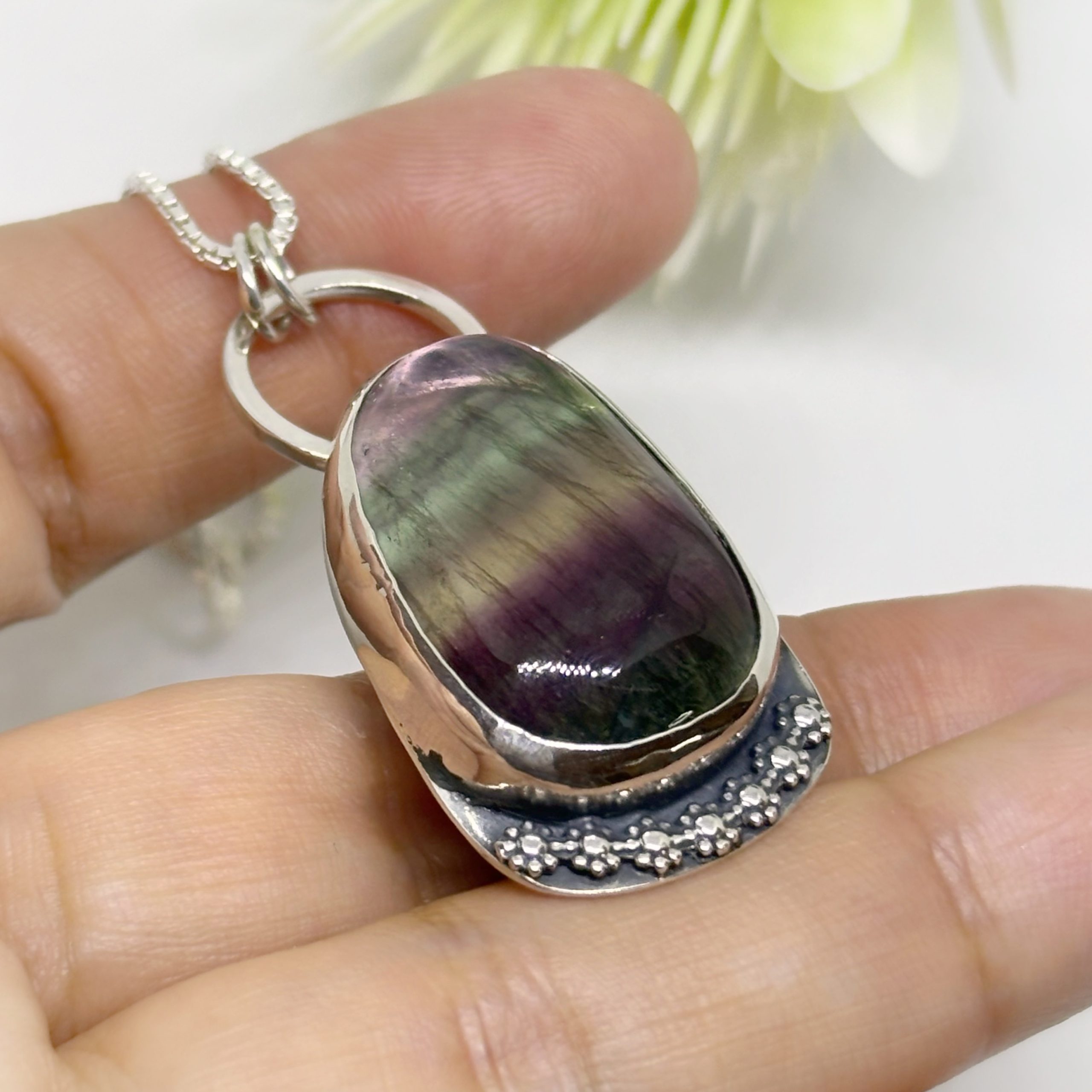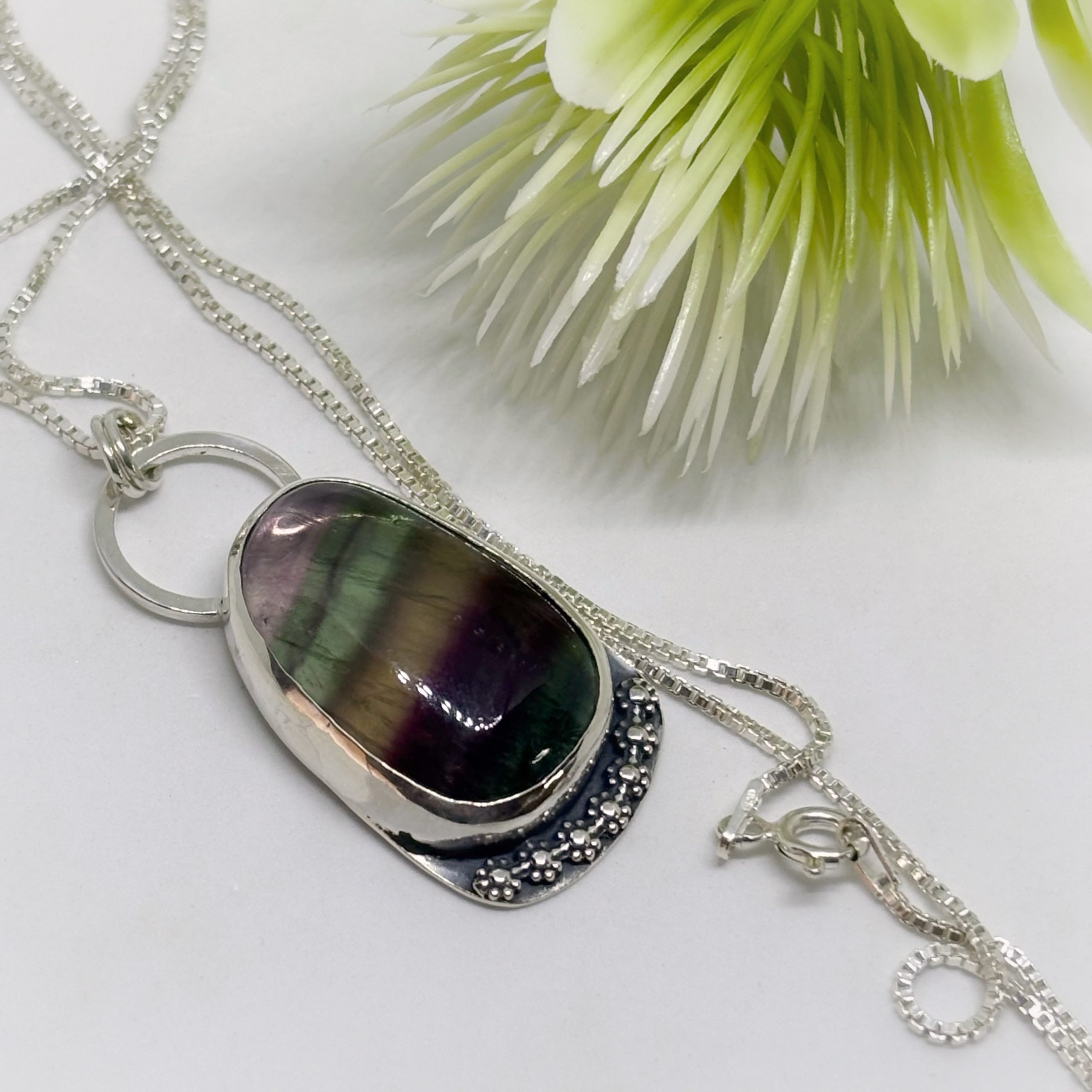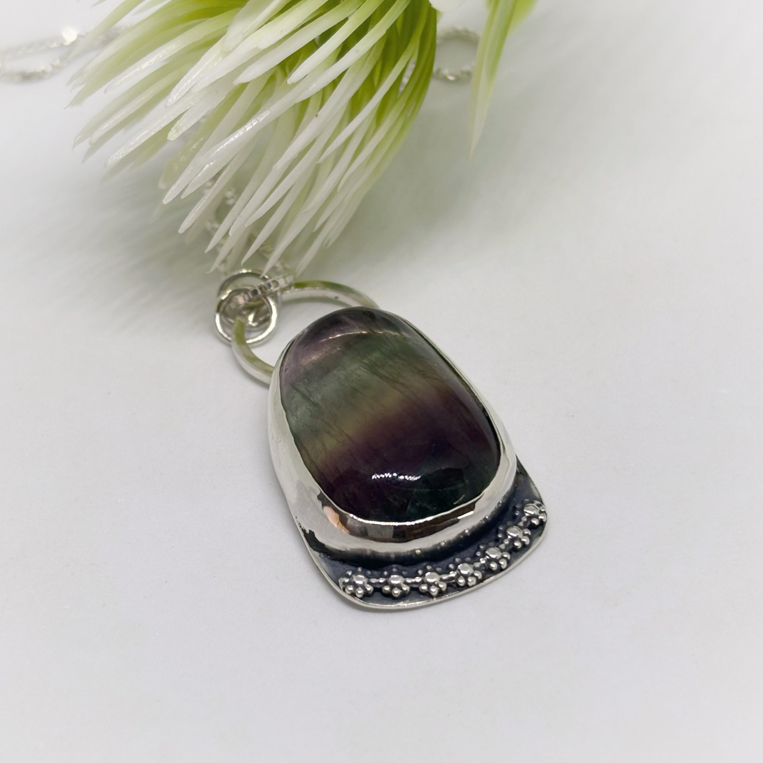 Colgante de plata 950 envejecida, y una hermosa fluorita, piedra natural y lapidada a mano, notando una bonita fusión de la naturaleza, representada por las flores.