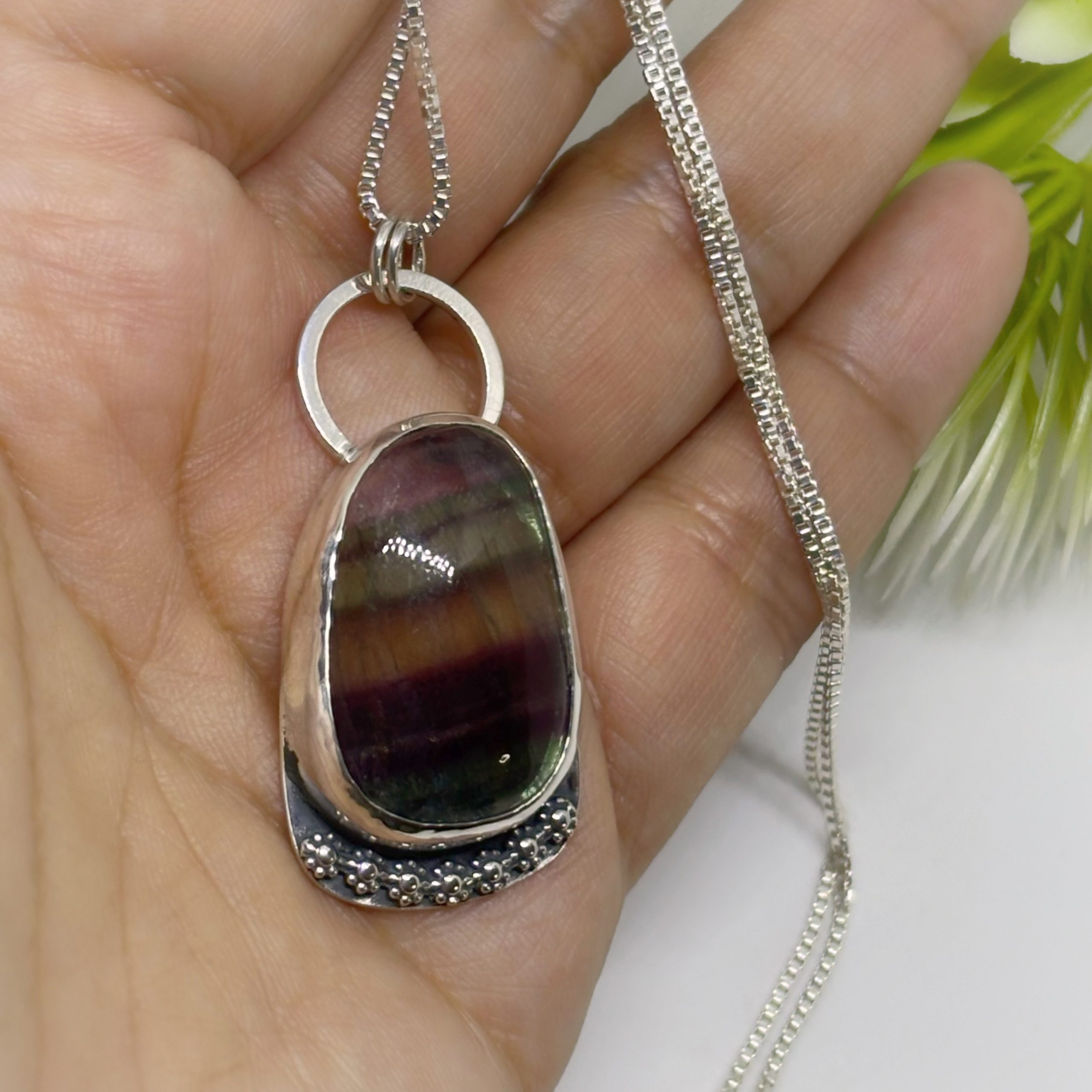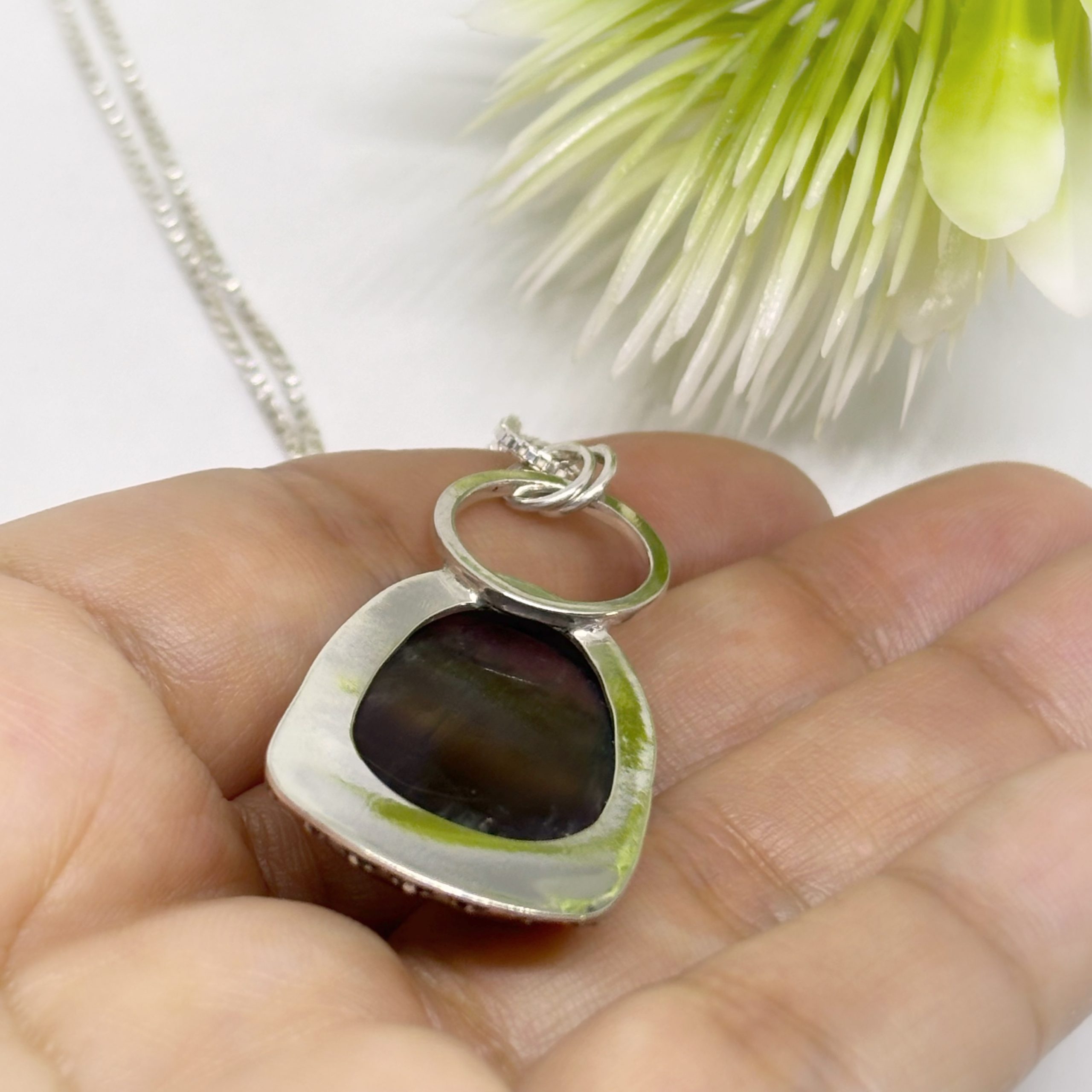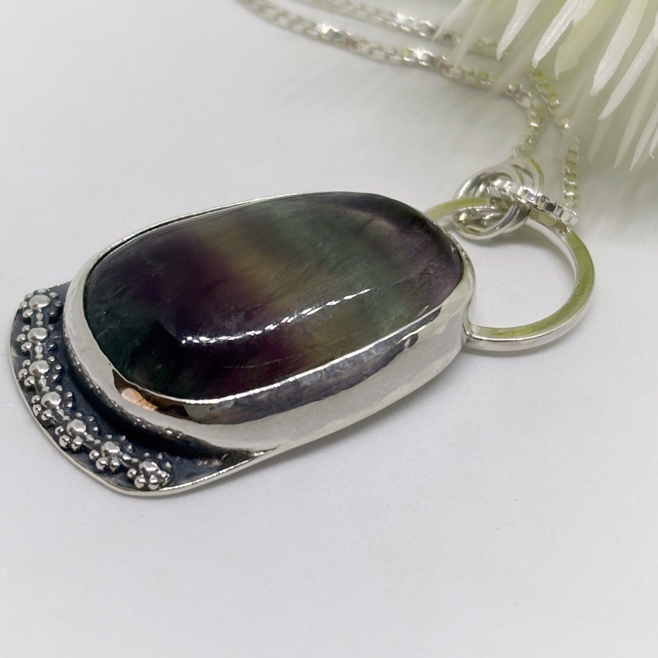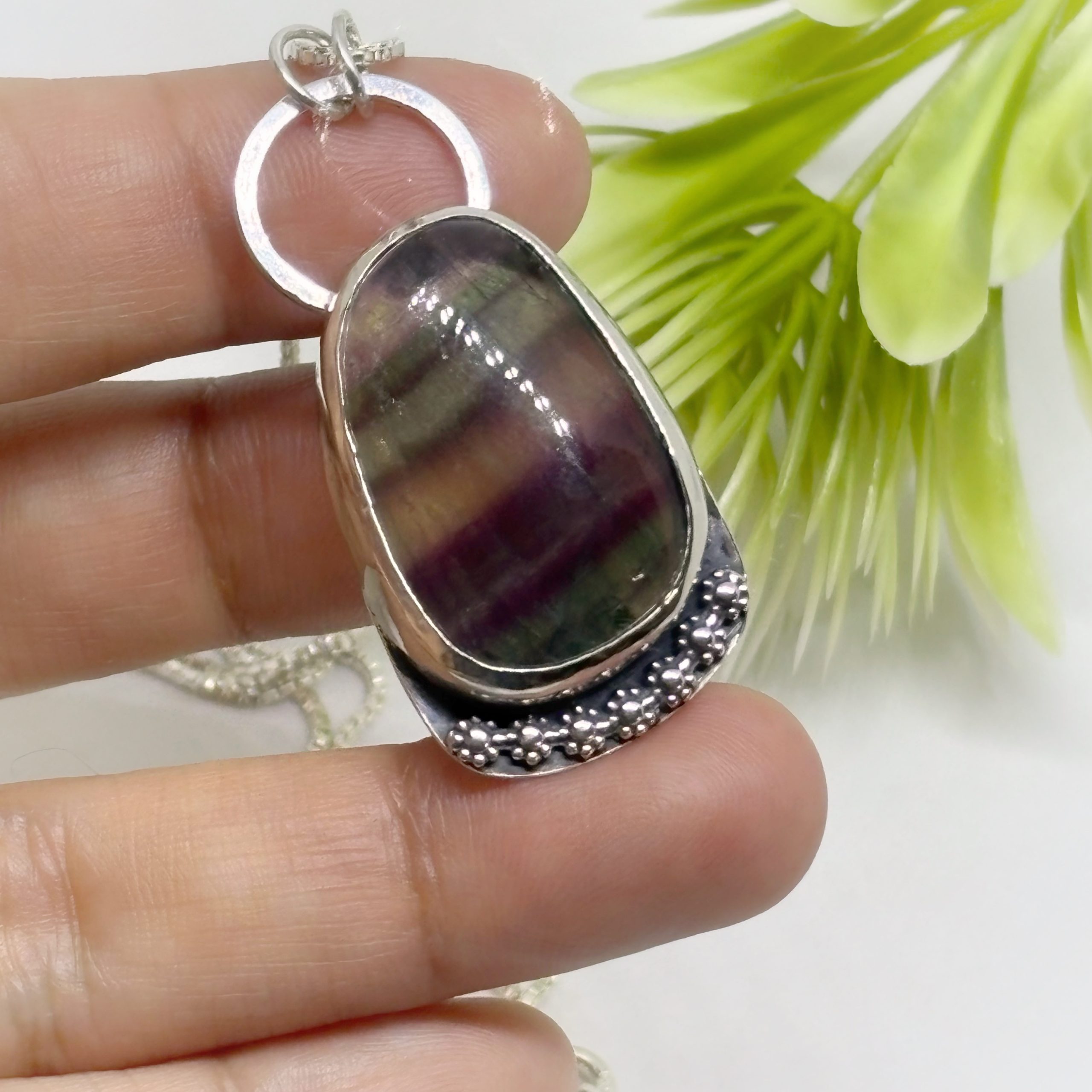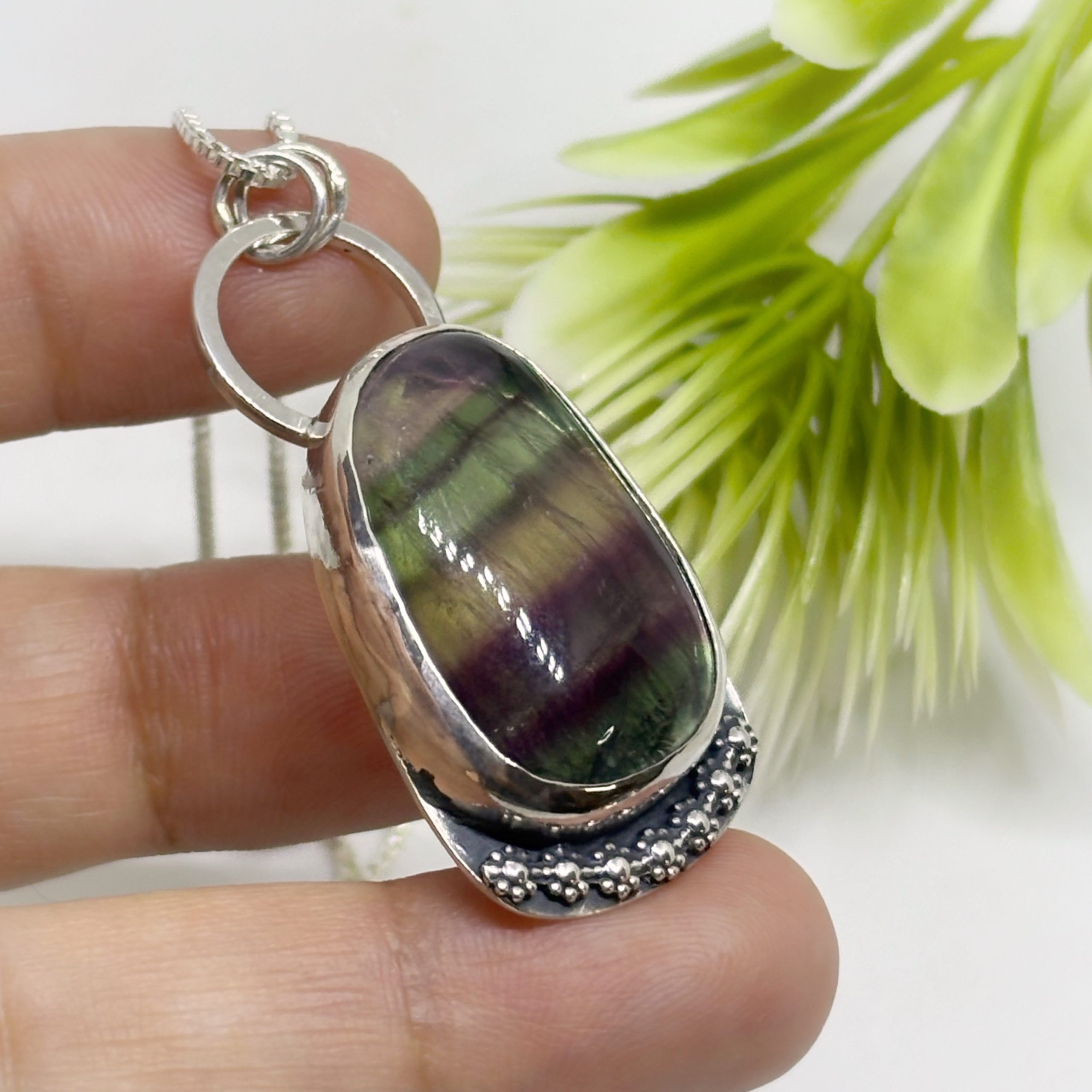 Colgante de plata 950 envejecida, y una hermosa fluorita, piedra natural y lapidada a mano, notando una bonita fusión de la naturaleza, representada por las flores.